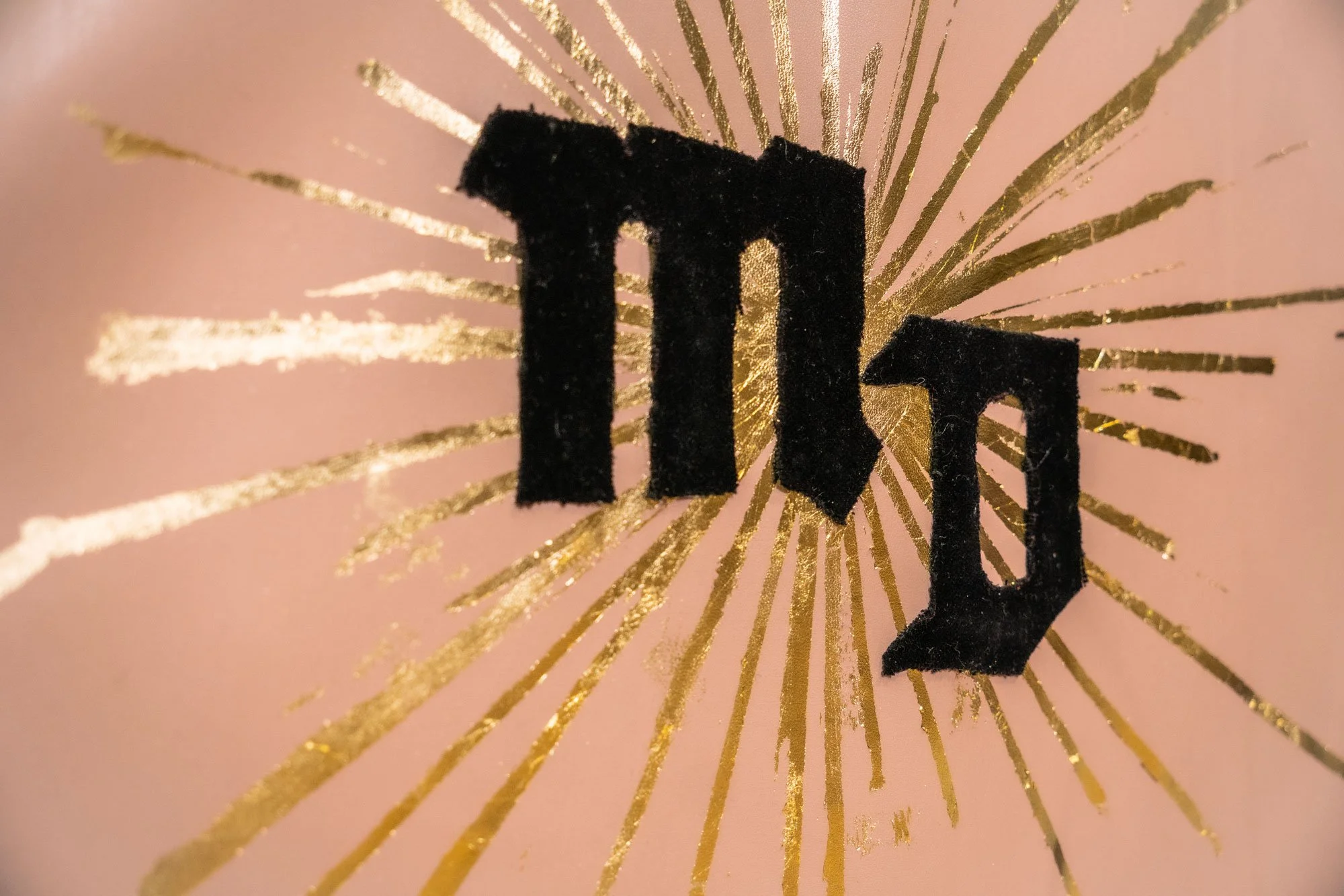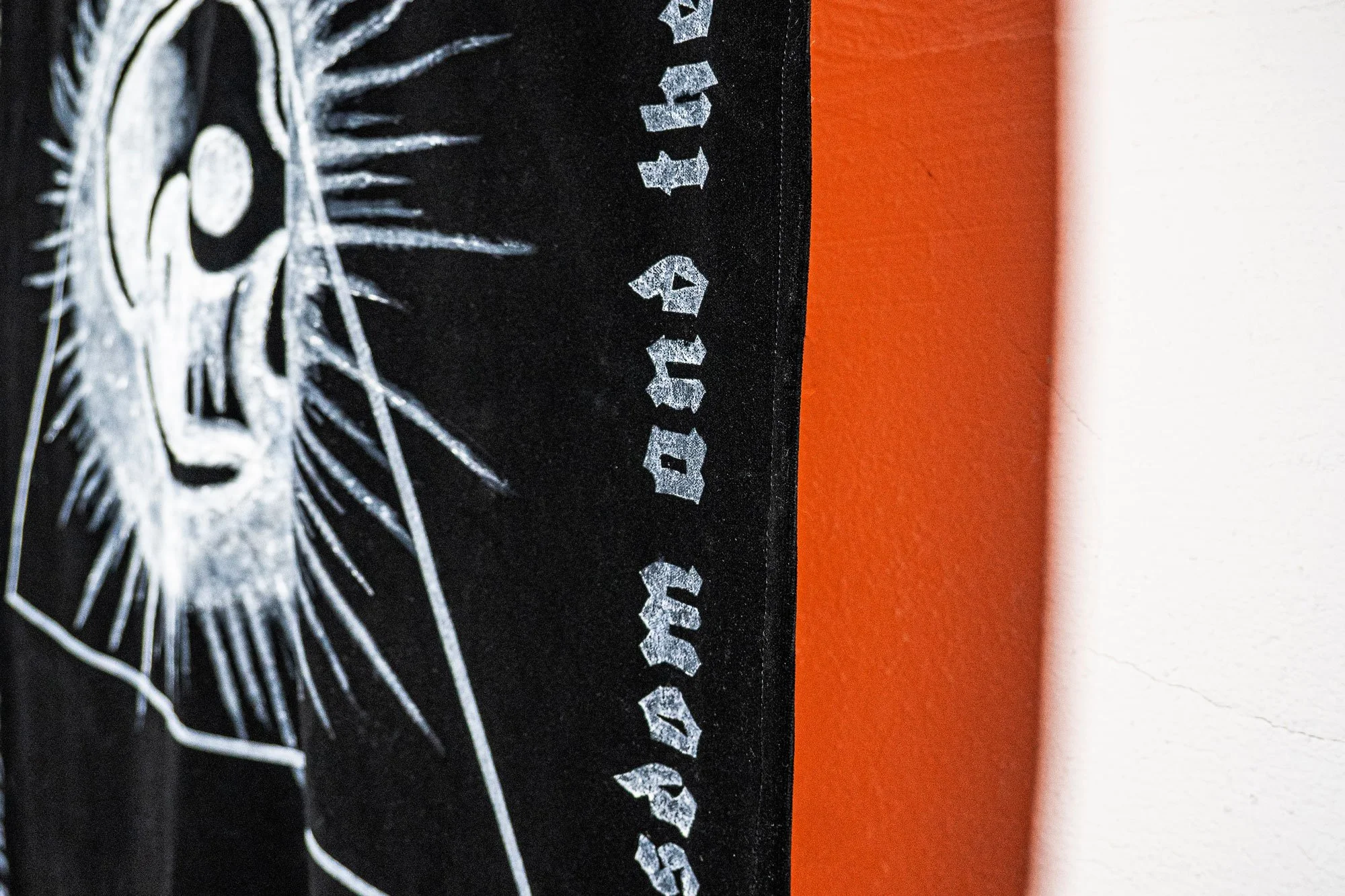 Banner, 180x120 cm. Velvet, leather, acrylic paint, spray paint, leaf gold (2023).